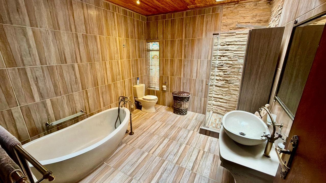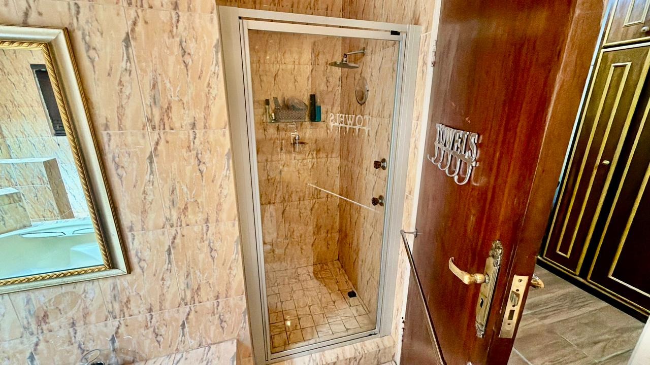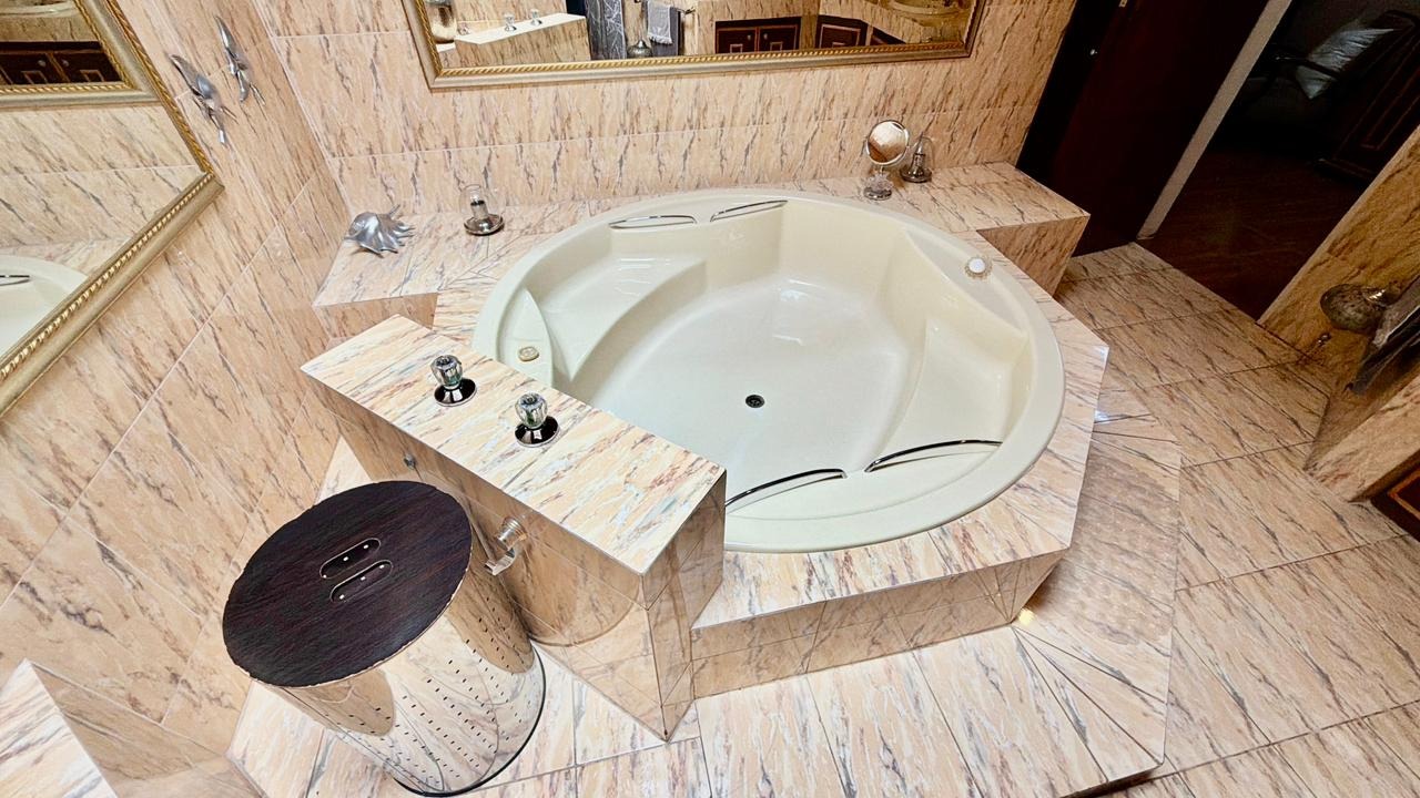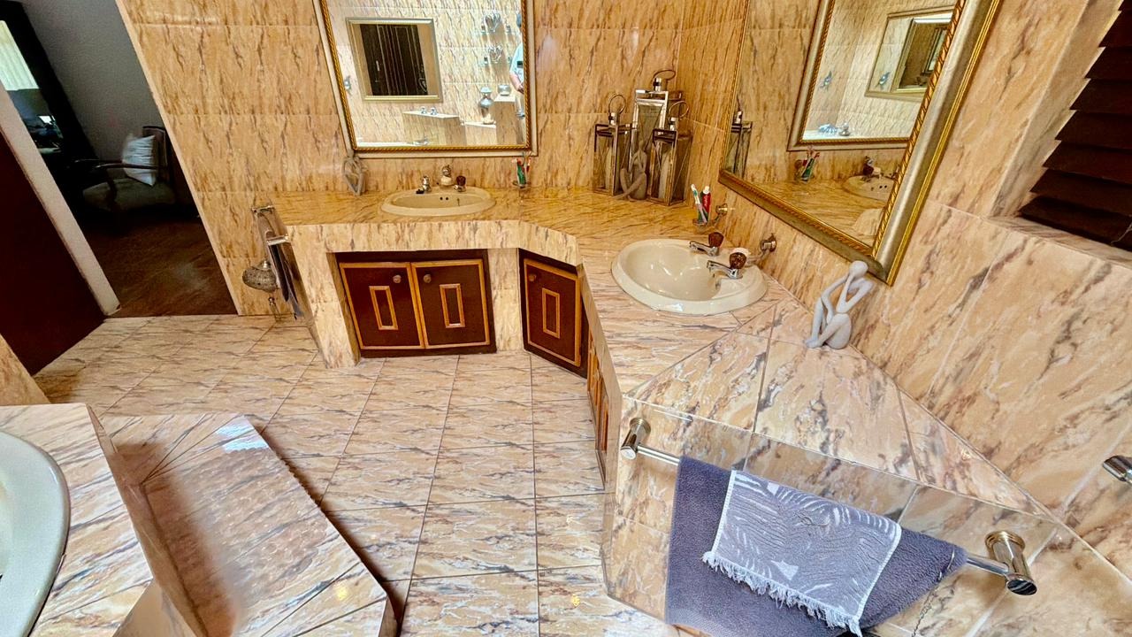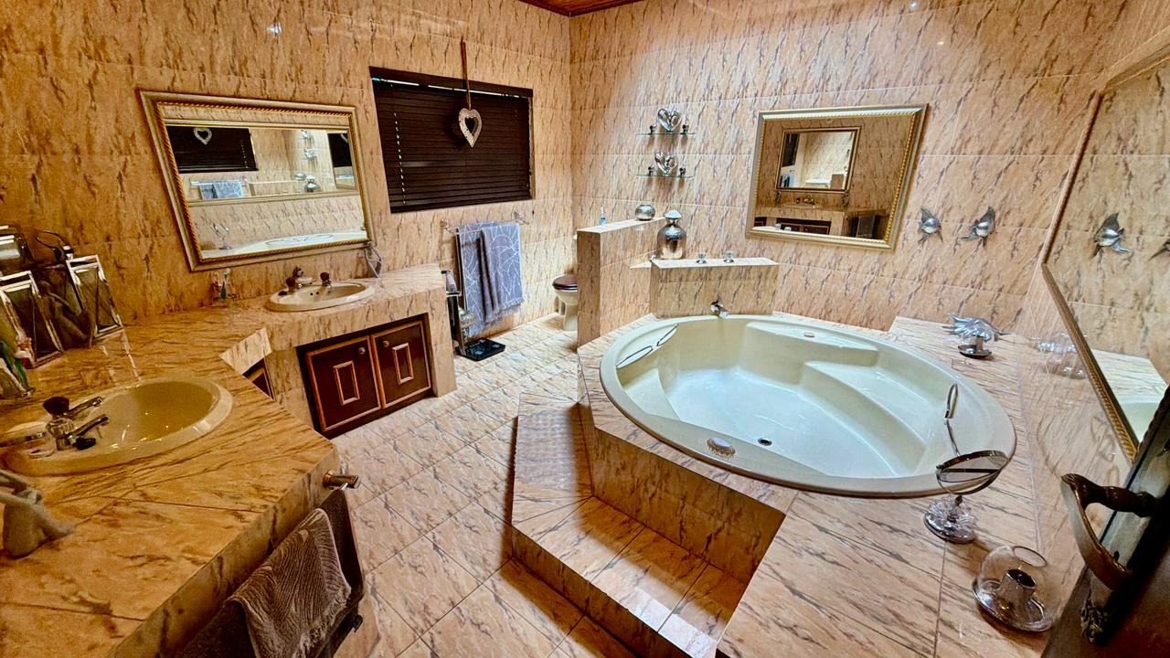 The interior boasts versatile living spaces, including two well-appointed kitchens, two distinct dining rooms, and multiple lounges, ensuring ample room for every occasion. Features such as air conditioning provide comfort throughout the year, while a stylish built-in bar and elegant sliding doors enhance the aesthetic appeal. The charming wood ceilings add a touch of warmth and character to the main living areas.