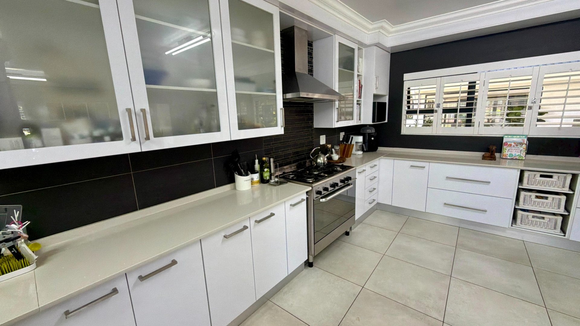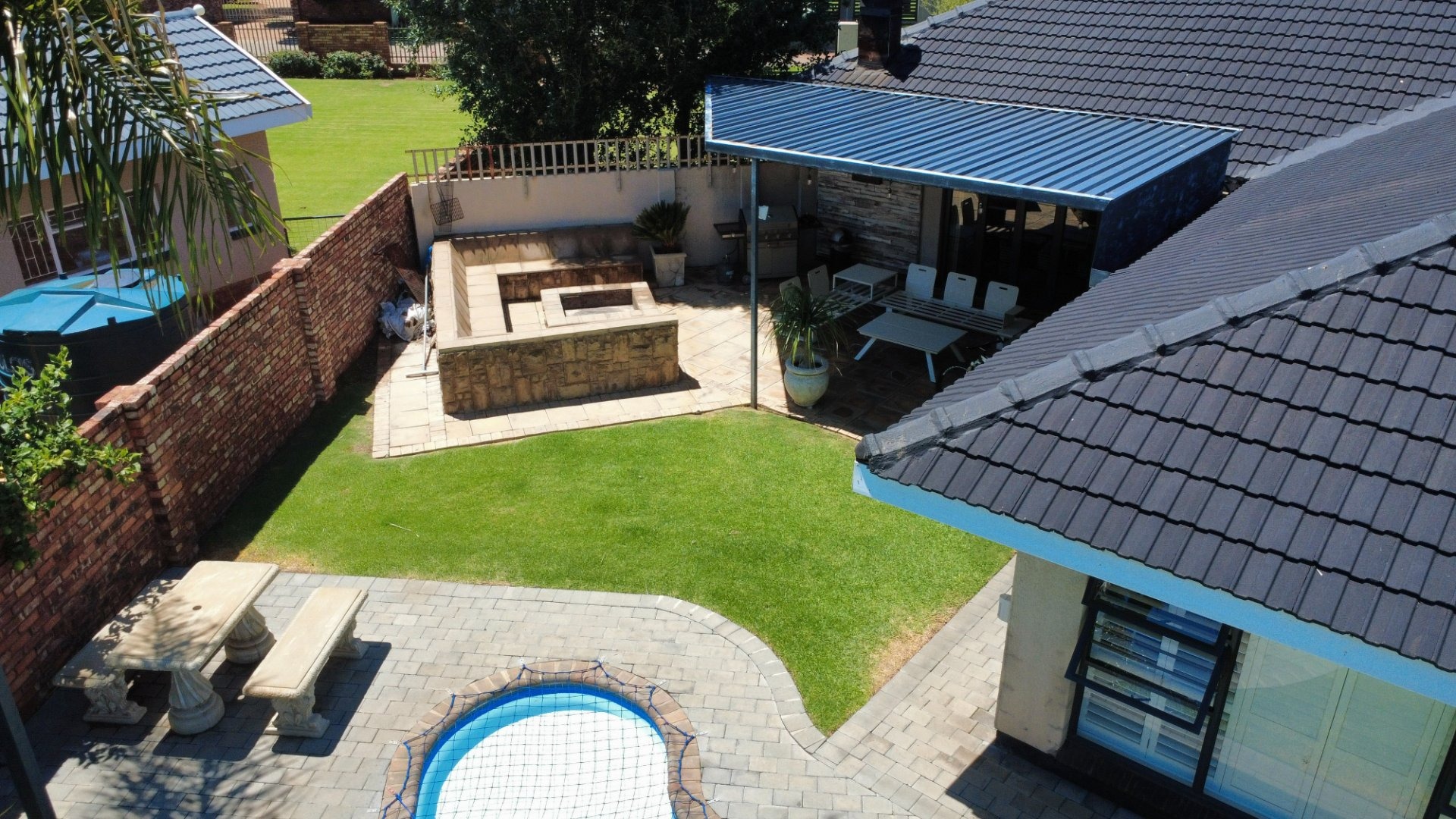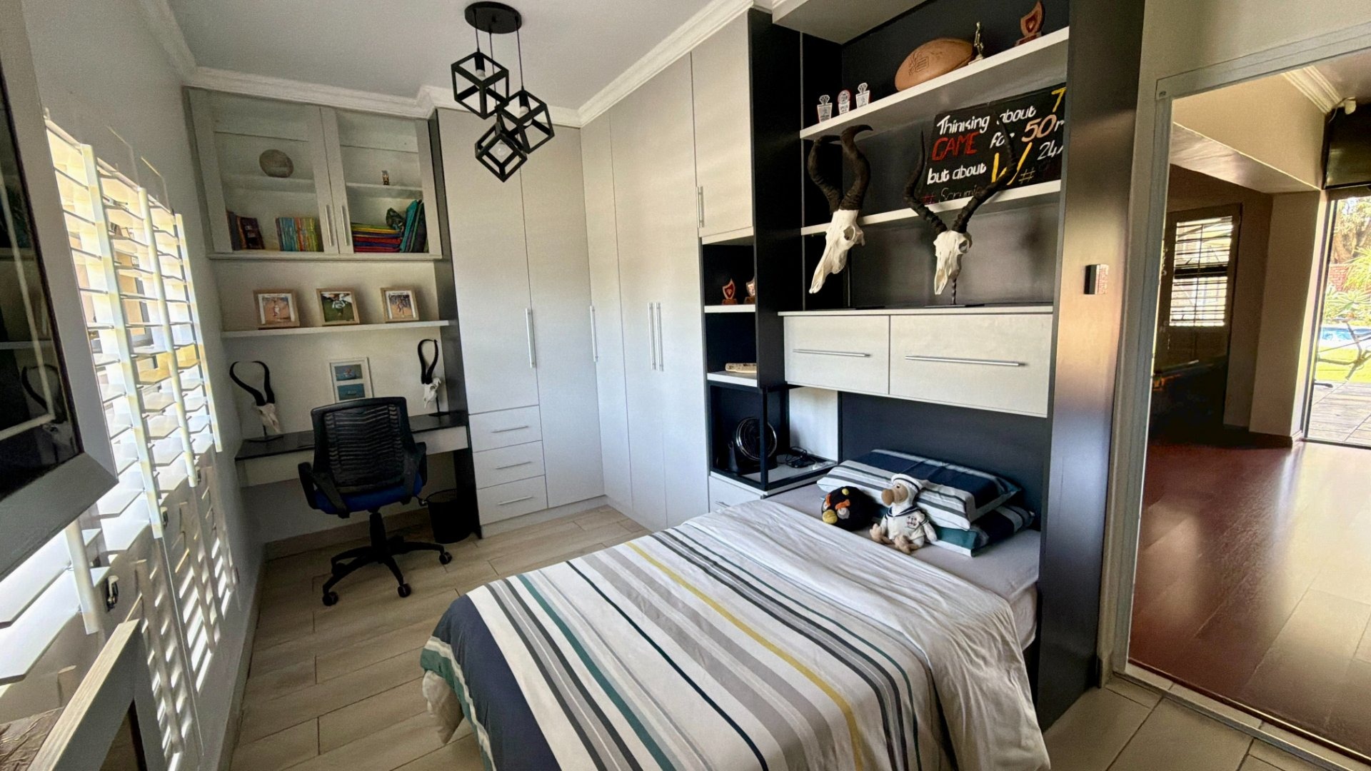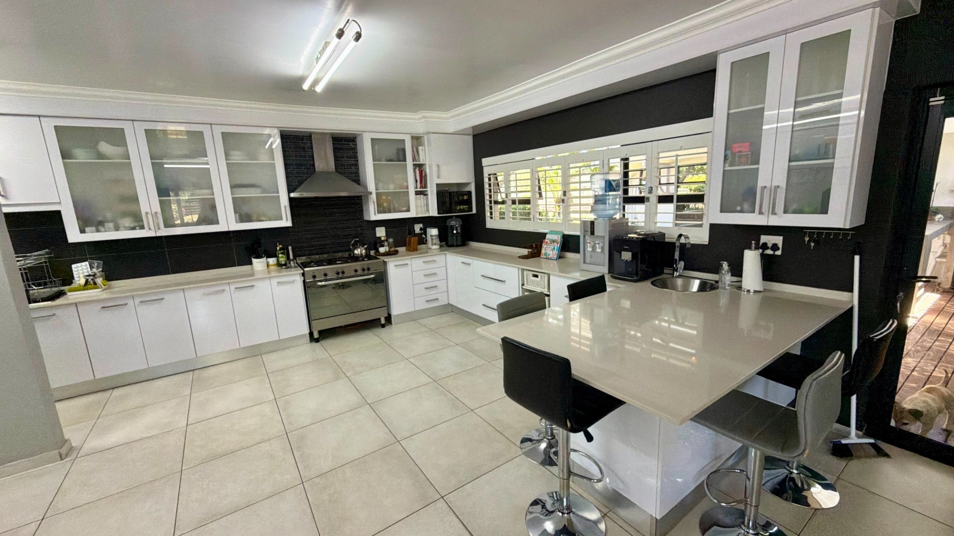 The designer open-plan kitchen forms the heart of the home for the ladies, whereas for the men the entertainment zone which consists of built-in bar and built-in braai with stack doors that lead to the sparkling pool and patio area with boma, creates a beautiful setting for hosting family and friends all year round.
