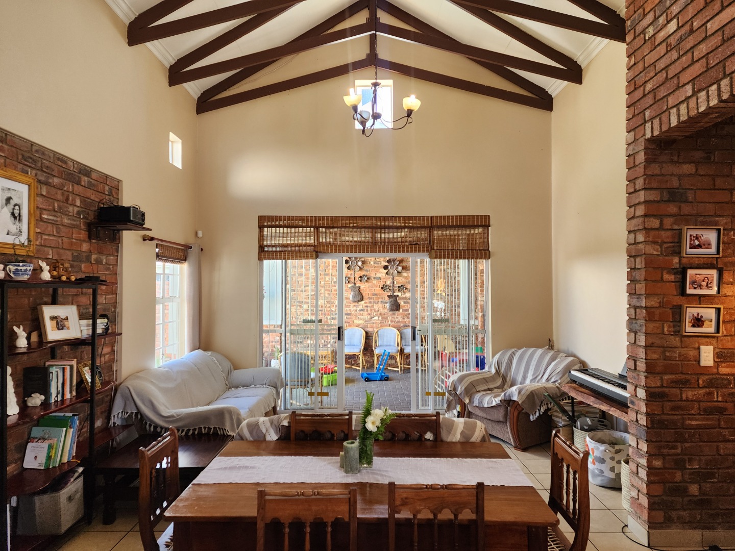 * Open-plan kitchen and living room with vaulted ceilings and exposed beams.