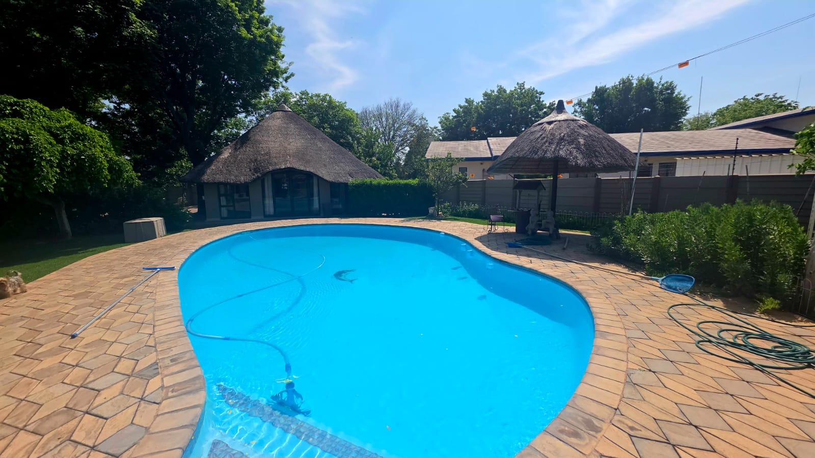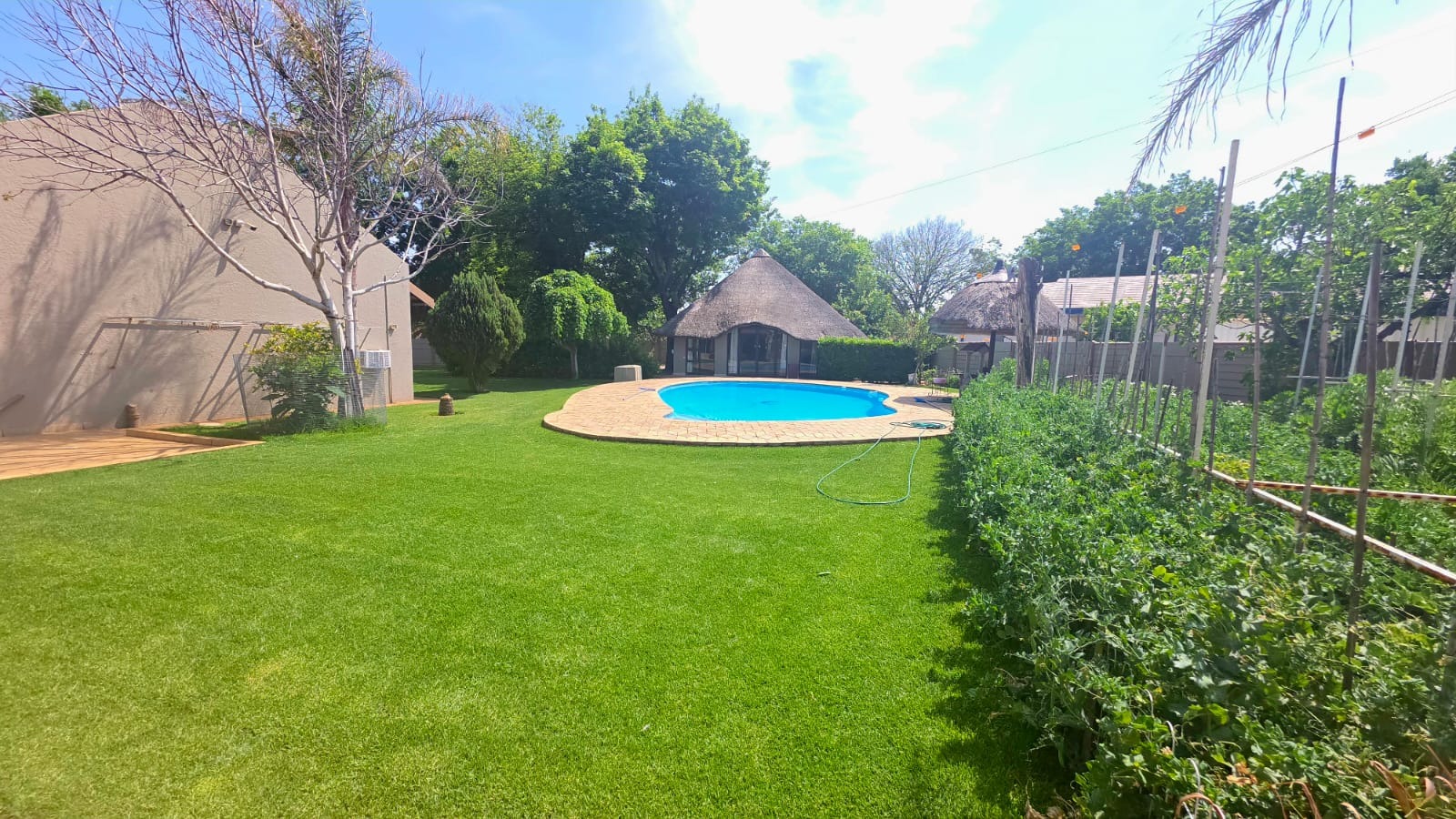 - Sparkling swimming pool surrounded by a lush, landscaped garden