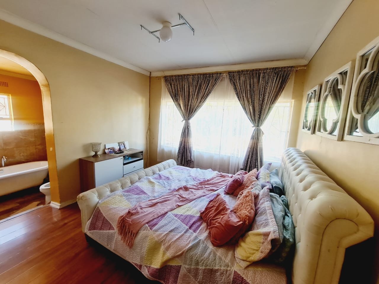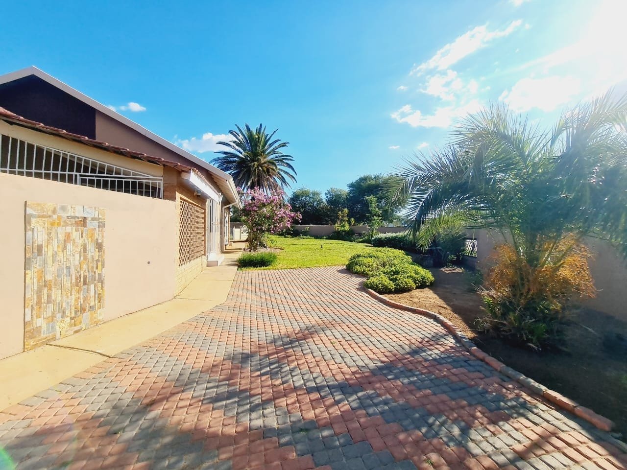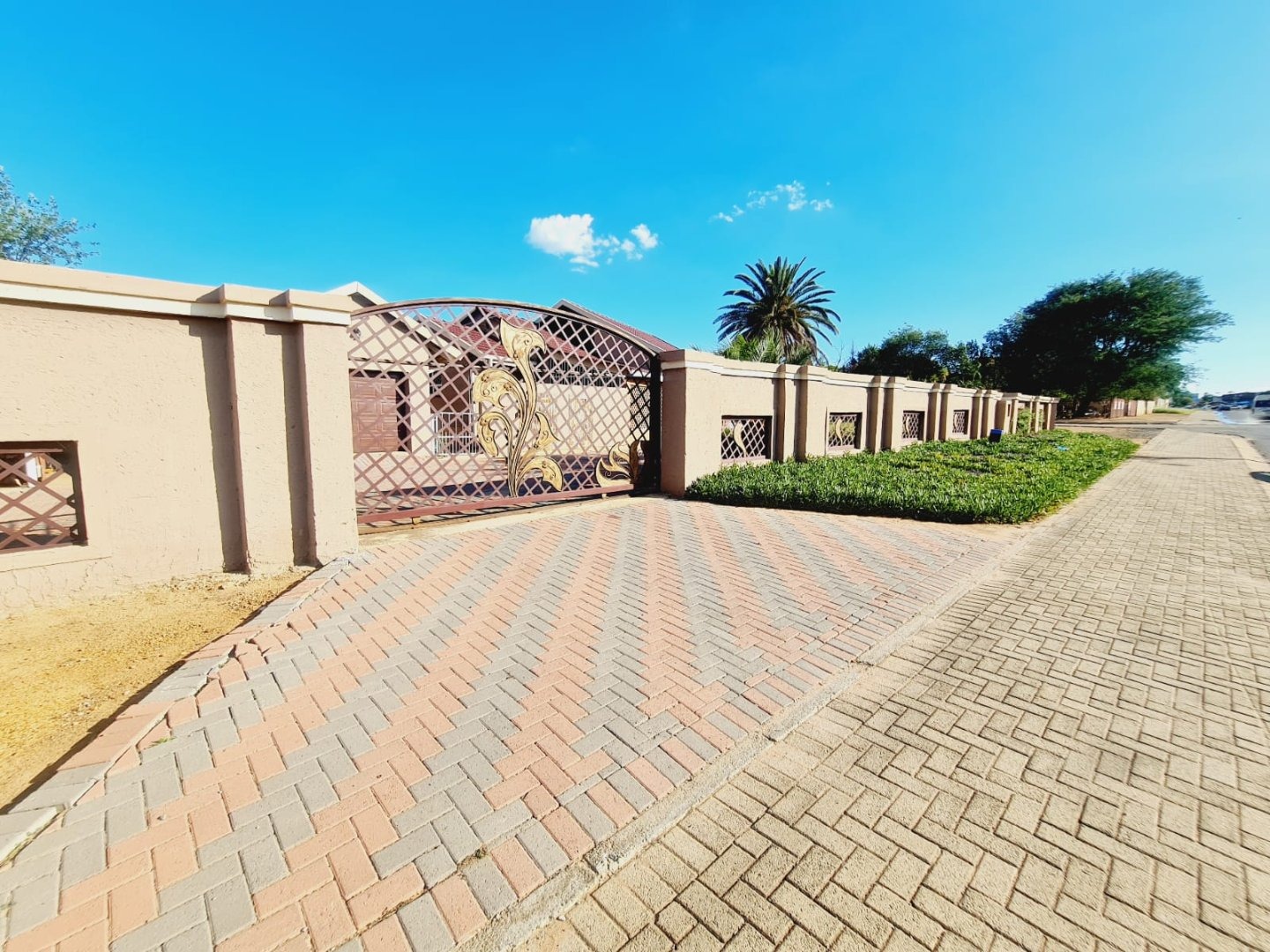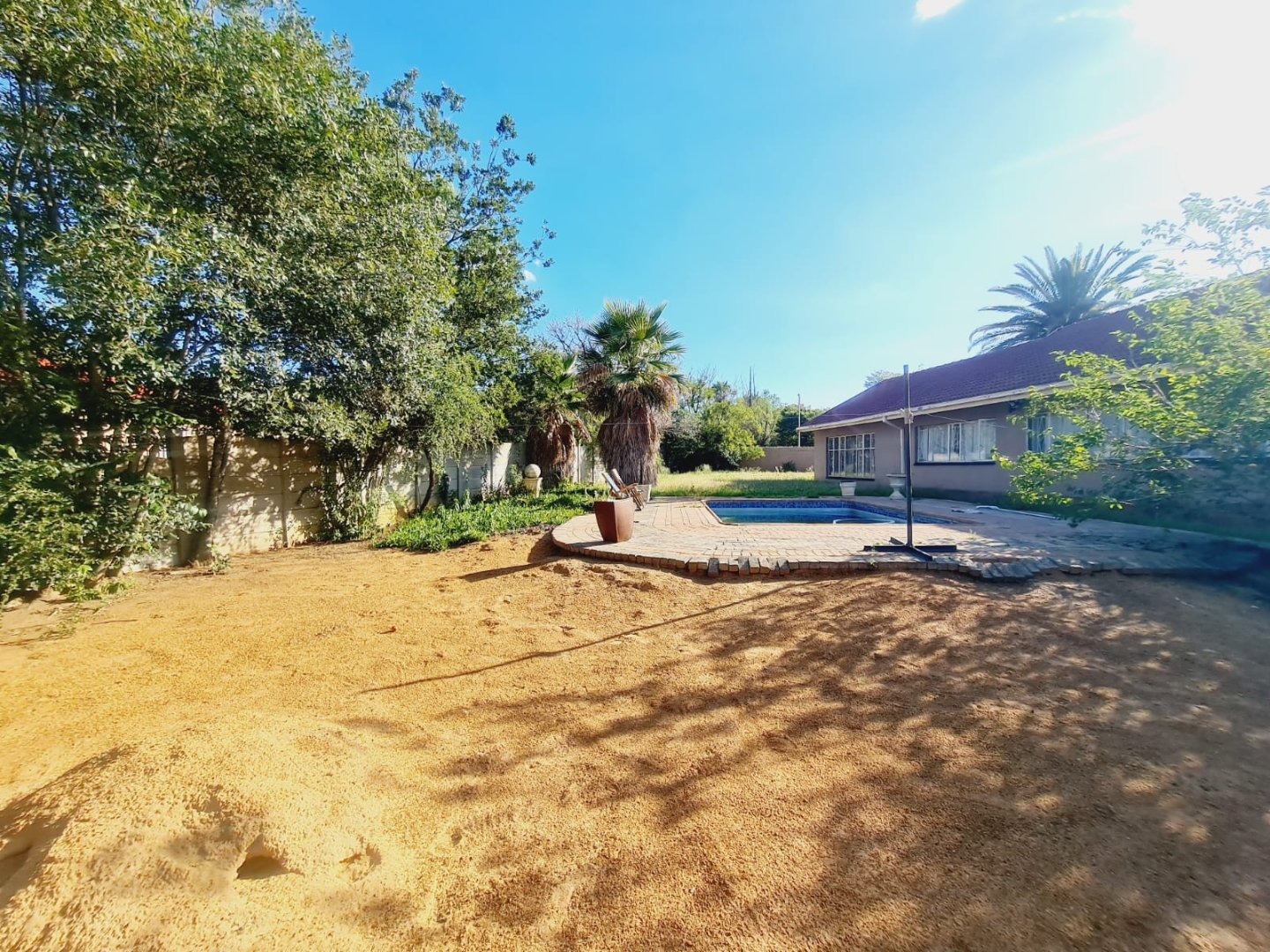 Discover this inviting 3-bedroom, 2-bathroom residence located in the established suburb of Songloed, Klerksdorp, South Africa. The property immediately impresses with its strong kerb appeal, featuring a secure, high perimeter wall with decorative elements and an ornate metal entrance gate, ensuring privacy and peace of mind. A spacious paved driveway leads to a double garage, offering ample parking and convenience, complemented by a well-maintained front garden with mature trees and lush green lawns. Step inside to a thoughtfully designed interior that includes a comfortable lounge and a dedicated dining room, perfect for family living and entertaining. The modern kitchen is a highlight, boasting dark wood cabinetry, granite countertops, and a stylish mosaic tile backsplash. It comes equipped with integrated appliances, including an electric hob, oven, and extractor hood, alongside a functional central island/breakfast bar, making it both practical and aesthetically pleasing. The home offers three well-proportioned bedrooms, providing comfortable accommodation. The two bathrooms include a main bathroom with extensive tiling and a classic clawfoot bathtub, while one bedroom benefits from an open-plan en-suite bathroom featuring a freestanding bathtub. While some areas present opportunities for cosmetic updates, the core structure offers a solid foundation. Outside, the property extends its appeal with a private swimming pool set within a paved surround, ideal for relaxation and recreation. The large backyard, bordered by mature trees, offers significant potential for landscaping and outdoor development, allowing you to create your dream outdoor oasis. Songloed is a residential area known for its community feel and convenient access to local amenities in Klerksdorp. Key Features: * 3 Bedrooms, 2 Bathrooms * Modern Kitchen with Granite Countertops * Spacious Lounge and Dining Room * Double Garage (Enclosed & Carport) * Private Swimming Pool * Large, Established Garden * Secure Perimeter Wall and Gate * Paved Driveway with Ample Parking * Potential for Outdoor Customisation