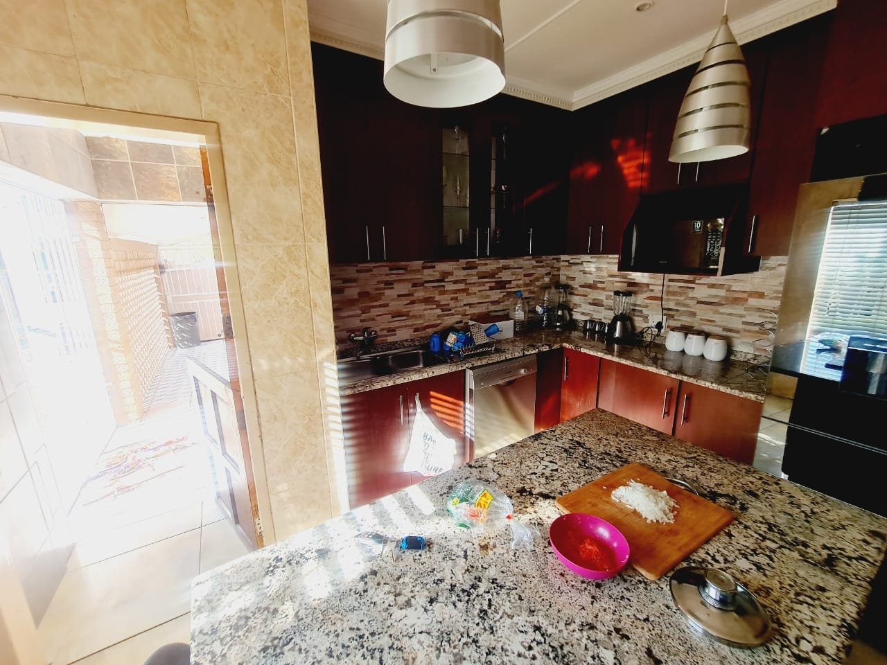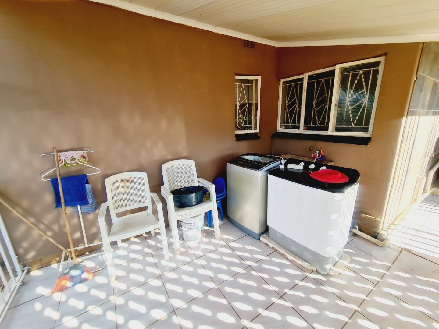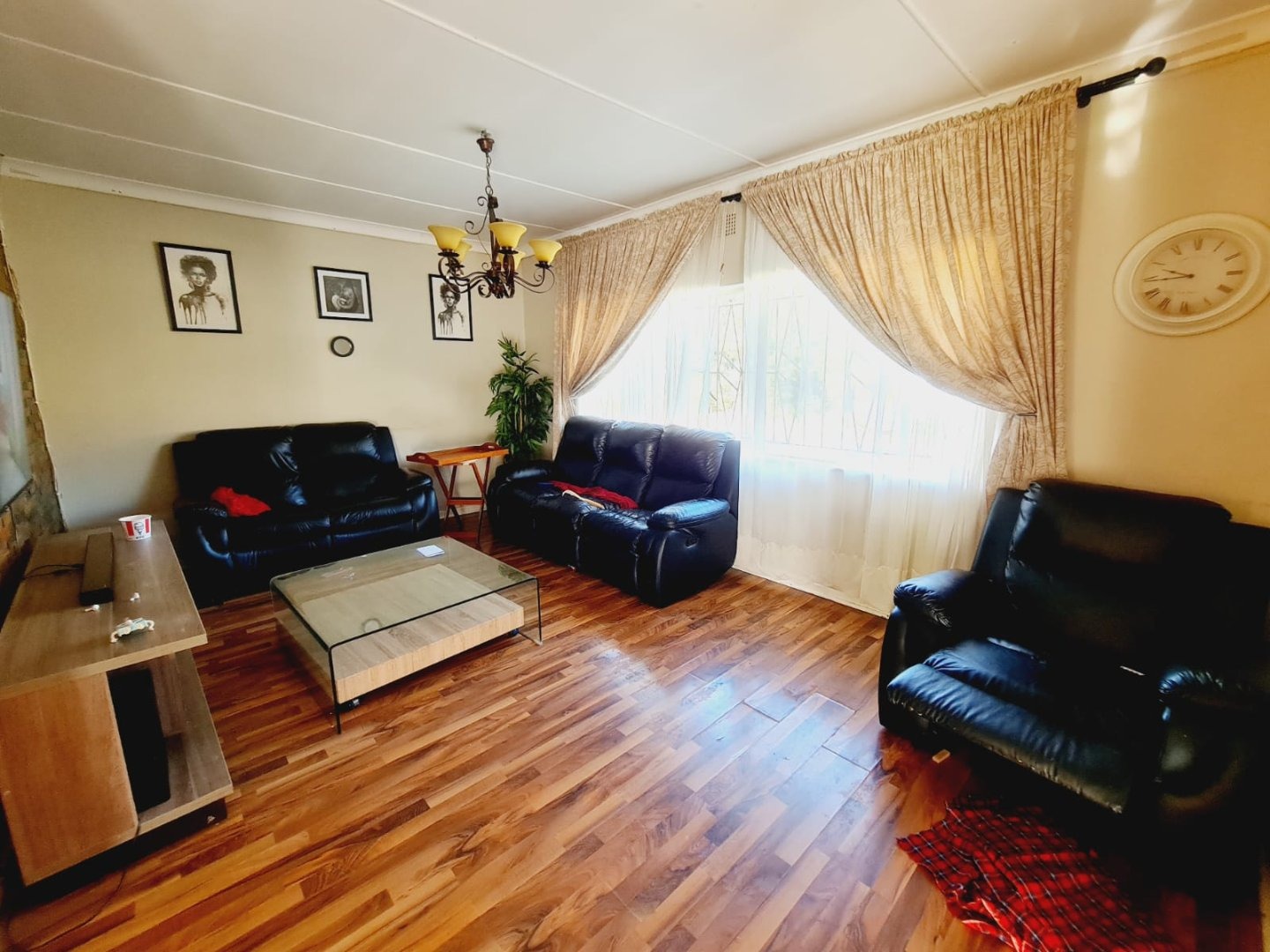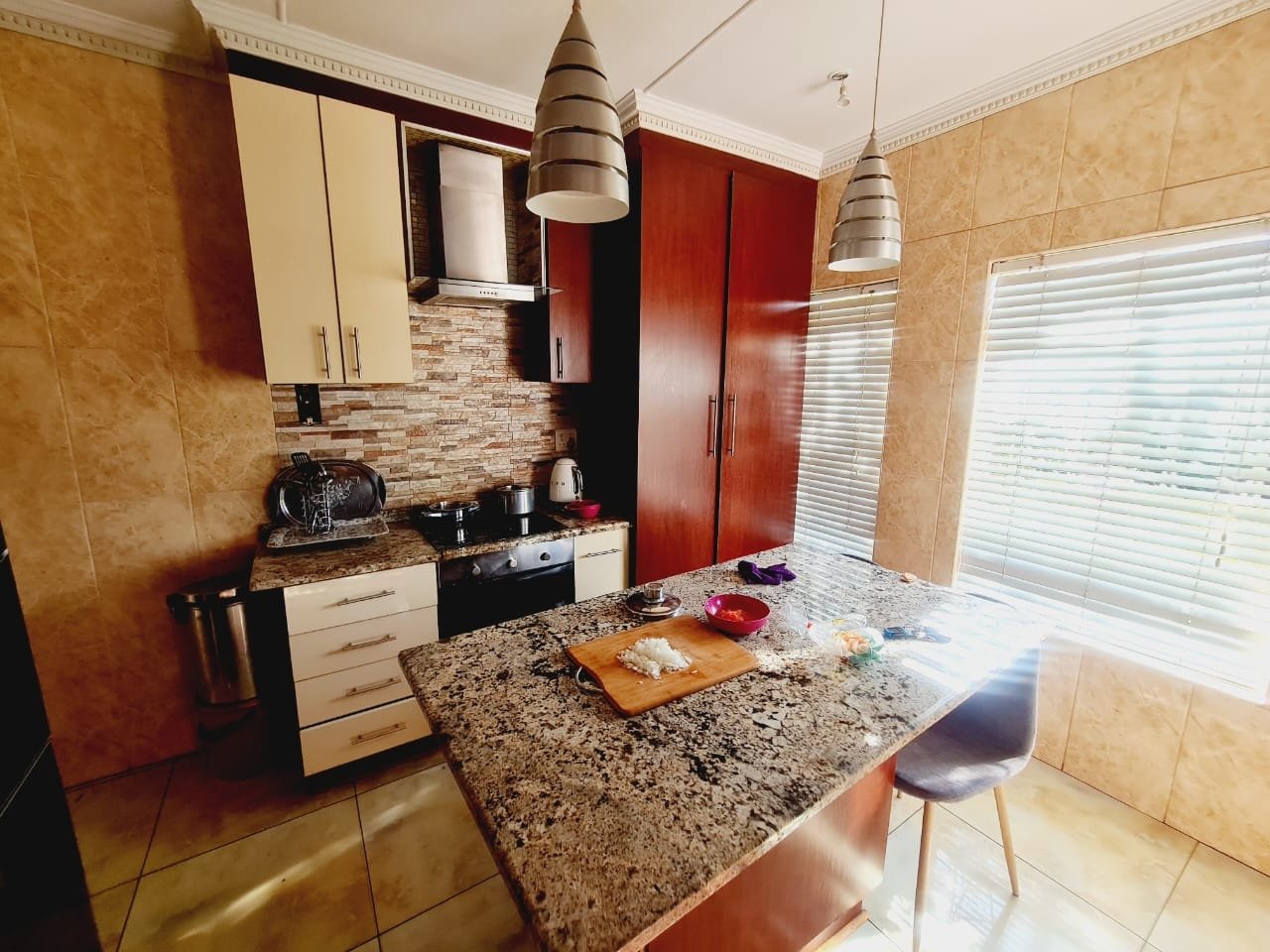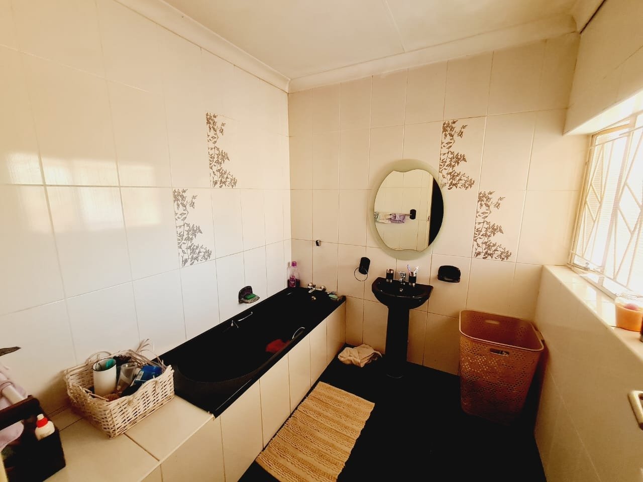 Discover this inviting 3-bedroom, 2-bathroom residence located in the established suburb of Songloed, Klerksdorp, South Africa. The property immediately impresses with its strong kerb appeal, featuring a secure, high perimeter wall with decorative elements and an ornate metal entrance gate, ensuring privacy and peace of mind. A spacious paved driveway leads to a double garage, offering ample parking and convenience, complemented by a well-maintained front garden with mature trees and lush green lawns. Step inside to a thoughtfully designed interior that includes a comfortable lounge and a dedicated dining room, perfect for family living and entertaining. The modern kitchen is a highlight, boasting dark wood cabinetry, granite countertops, and a stylish mosaic tile backsplash. It comes equipped with integrated appliances, including an electric hob, oven, and extractor hood, alongside a functional central island/breakfast bar, making it both practical and aesthetically pleasing. The home offers three well-proportioned bedrooms, providing comfortable accommodation. The two bathrooms include a main bathroom with extensive tiling and a classic clawfoot bathtub, while one bedroom benefits from an open-plan en-suite bathroom featuring a freestanding bathtub. While some areas present opportunities for cosmetic updates, the core structure offers a solid foundation. Outside, the property extends its appeal with a private swimming pool set within a paved surround, ideal for relaxation and recreation. The large backyard, bordered by mature trees, offers significant potential for landscaping and outdoor development, allowing you to create your dream outdoor oasis. Songloed is a residential area known for its community feel and convenient access to local amenities in Klerksdorp. Key Features: * 3 Bedrooms, 2 Bathrooms * Modern Kitchen with Granite Countertops * Spacious Lounge and Dining Room * Double Garage (Enclosed & Carport) * Private Swimming Pool * Large, Established Garden * Secure Perimeter Wall and Gate * Paved Driveway with Ample Parking * Potential for Outdoor Customisation