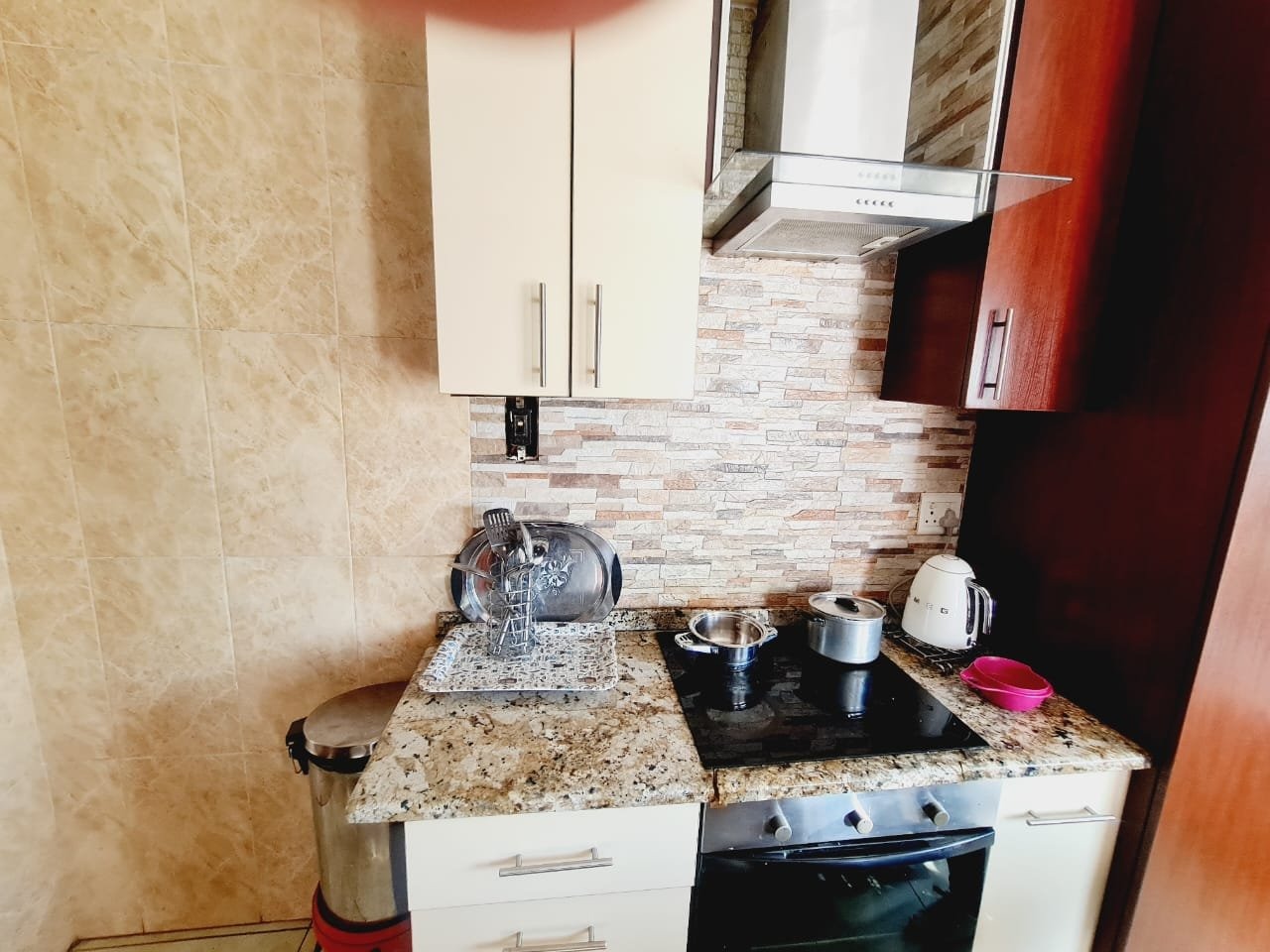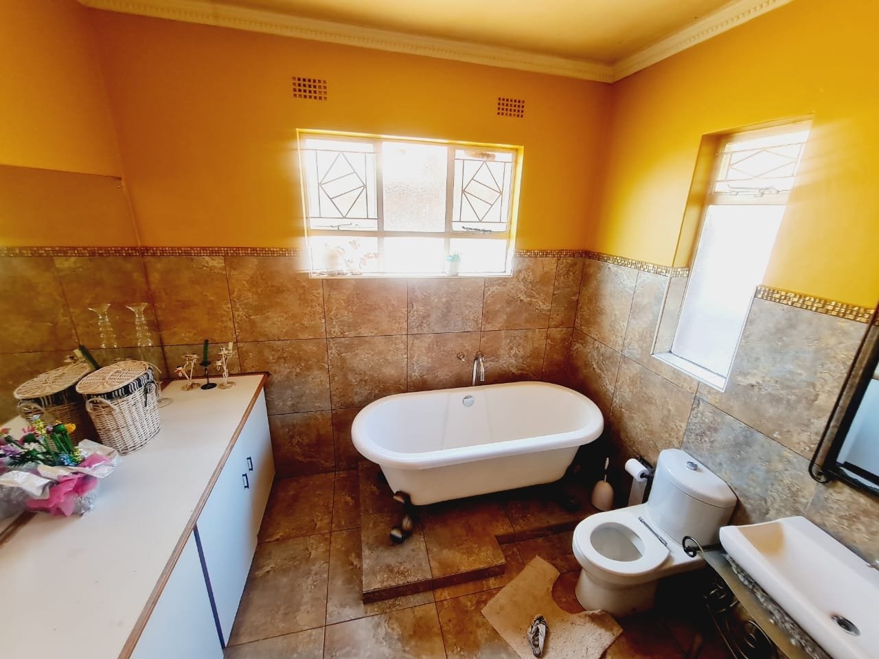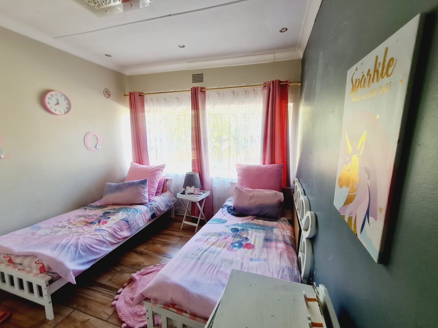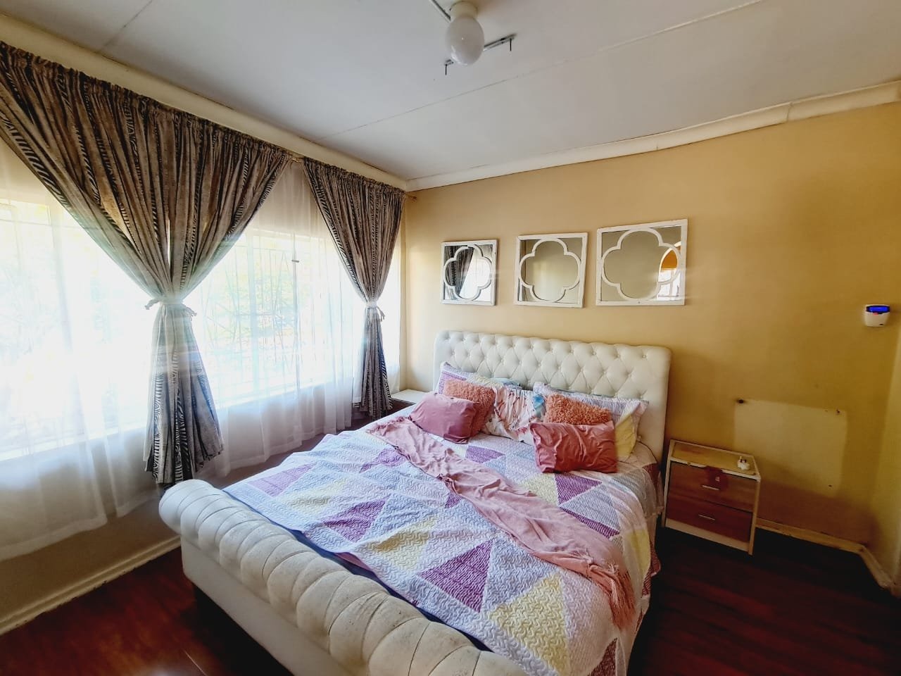 Discover this inviting 3-bedroom, 2-bathroom residence located in the established suburb of Songloed, Klerksdorp, South Africa. The property immediately impresses with its strong kerb appeal, featuring a secure, high perimeter wall with decorative elements and an ornate metal entrance gate, ensuring privacy and peace of mind. A spacious paved driveway leads to a double garage, offering ample parking and convenience, complemented by a well-maintained front garden with mature trees and lush green lawns. Step inside to a thoughtfully designed interior that includes a comfortable lounge and a dedicated dining room, perfect for family living and entertaining. The modern kitchen is a highlight, boasting dark wood cabinetry, granite countertops, and a stylish mosaic tile backsplash. It comes equipped with integrated appliances, including an electric hob, oven, and extractor hood, alongside a functional central island/breakfast bar, making it both practical and aesthetically pleasing. The home offers three well-proportioned bedrooms, providing comfortable accommodation. The two bathrooms include a main bathroom with extensive tiling and a classic clawfoot bathtub, while one bedroom benefits from an open-plan en-suite bathroom featuring a freestanding bathtub. While some areas present opportunities for cosmetic updates, the core structure offers a solid foundation. Outside, the property extends its appeal with a private swimming pool set within a paved surround, ideal for relaxation and recreation. The large backyard, bordered by mature trees, offers significant potential for landscaping and outdoor development, allowing you to create your dream outdoor oasis. Songloed is a residential area known for its community feel and convenient access to local amenities in Klerksdorp. Key Features: * 3 Bedrooms, 2 Bathrooms * Modern Kitchen with Granite Countertops * Spacious Lounge and Dining Room * Double Garage (Enclosed & Carport) * Private Swimming Pool * Large, Established Garden * Secure Perimeter Wall and Gate * Paved Driveway with Ample Parking * Potential for Outdoor Customisation
