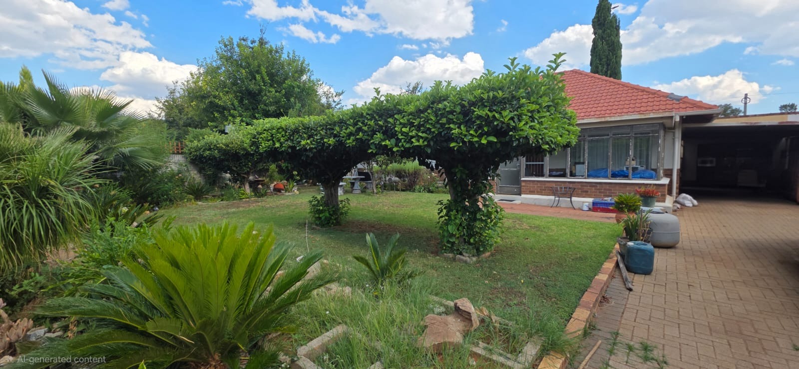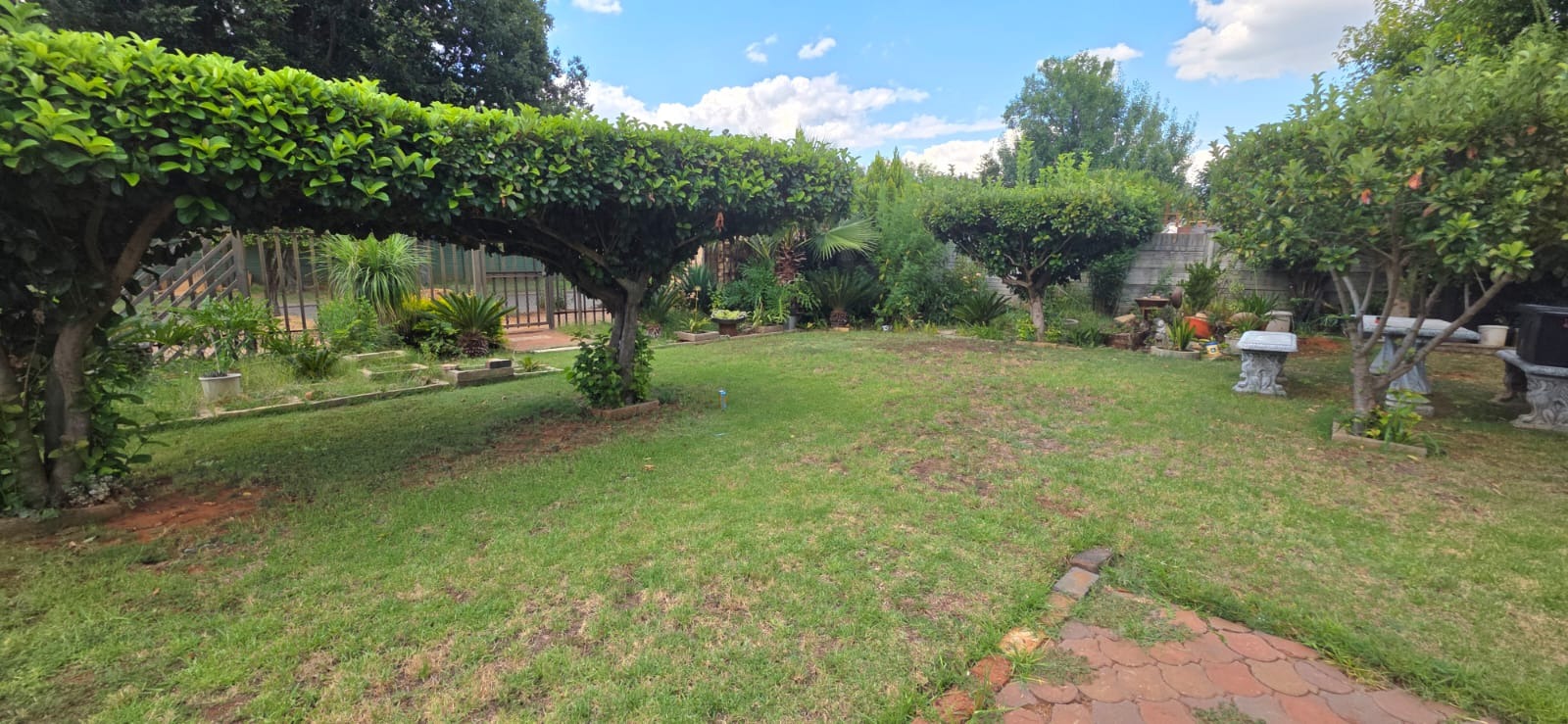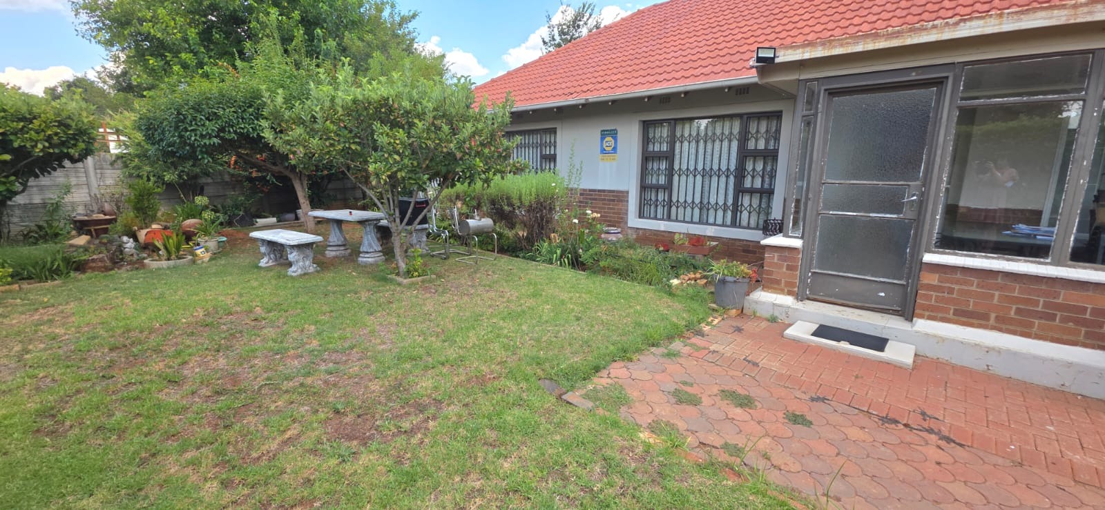 Outside, the garden is a real highlight, with mature trees and an outdoor stone seating area, perfect for enjoying the South African sunshine. There are also domestic rooms and outside toilets, adding to the property's functionality. Security features like window bars and an ADT sign provide peace of mind in this friendly neighbourhood.
