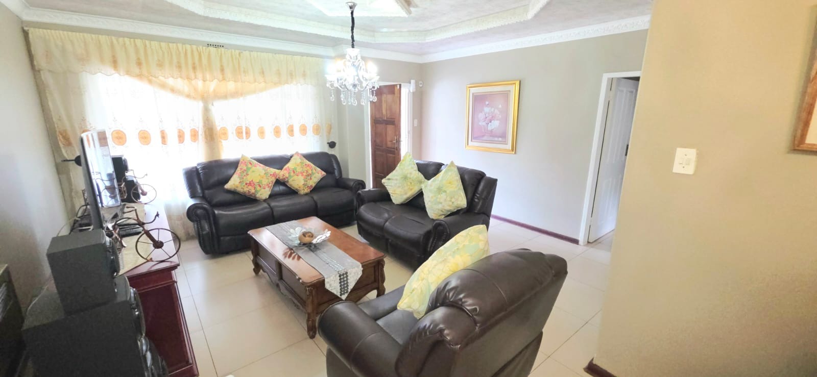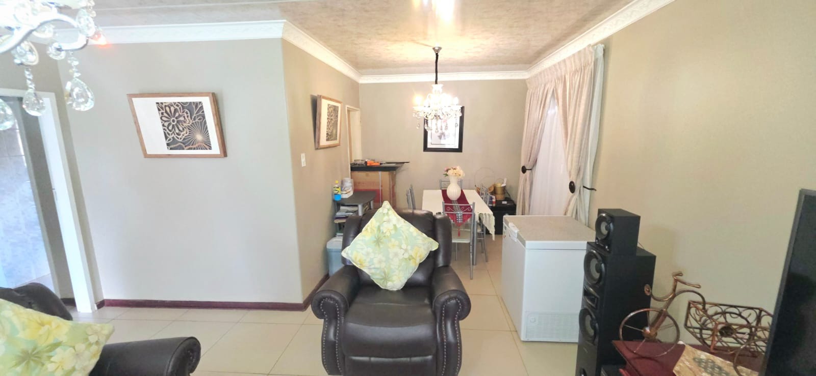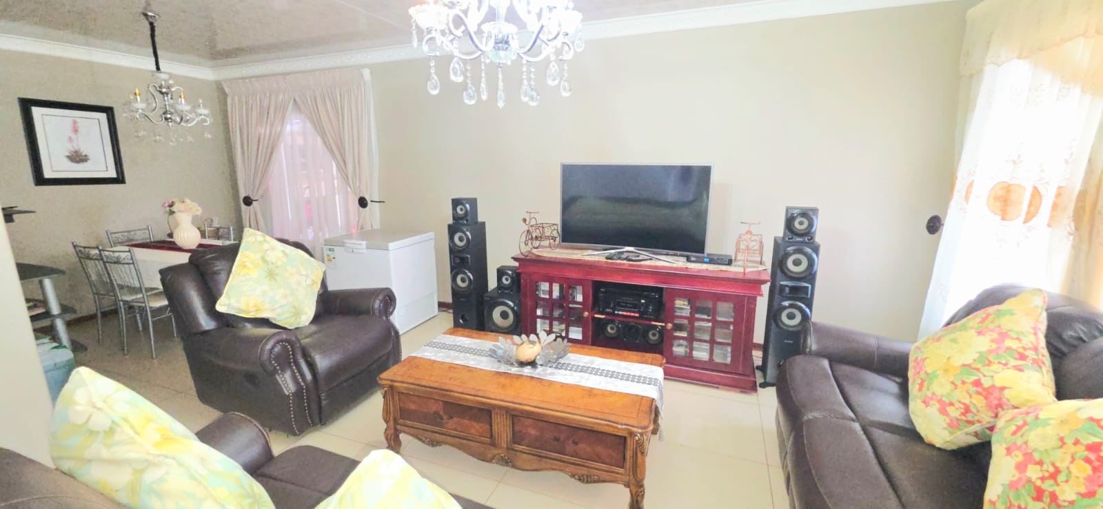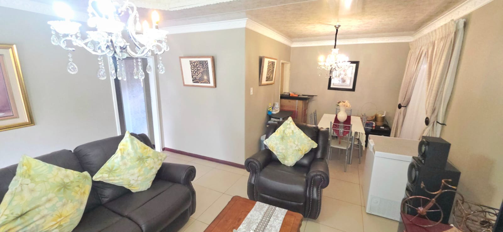 Step inside and discover a home with a warm and inviting feel. The combined living and dining area is a great spot for relaxing or entertaining, featuring neutral walls, durable tiled floors, and plenty of natural light streaming in through large windows. You'll find comfortable seating and decorative chandeliers that add a touch of charm to the space. The kitchen is practical and well-equipped with light wood-toned cabinetry, a built-in oven, and tiled flooring, making meal prep a breeze.