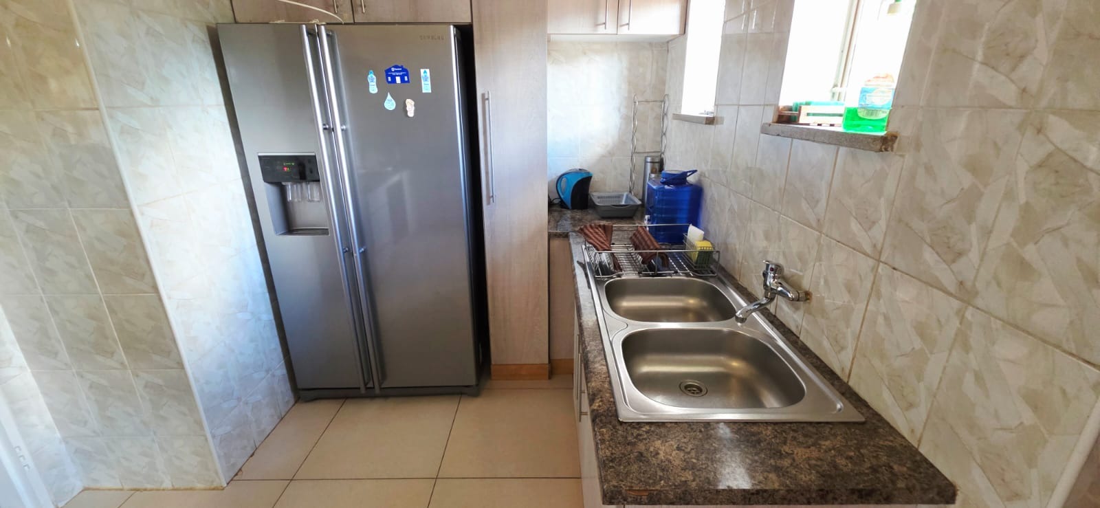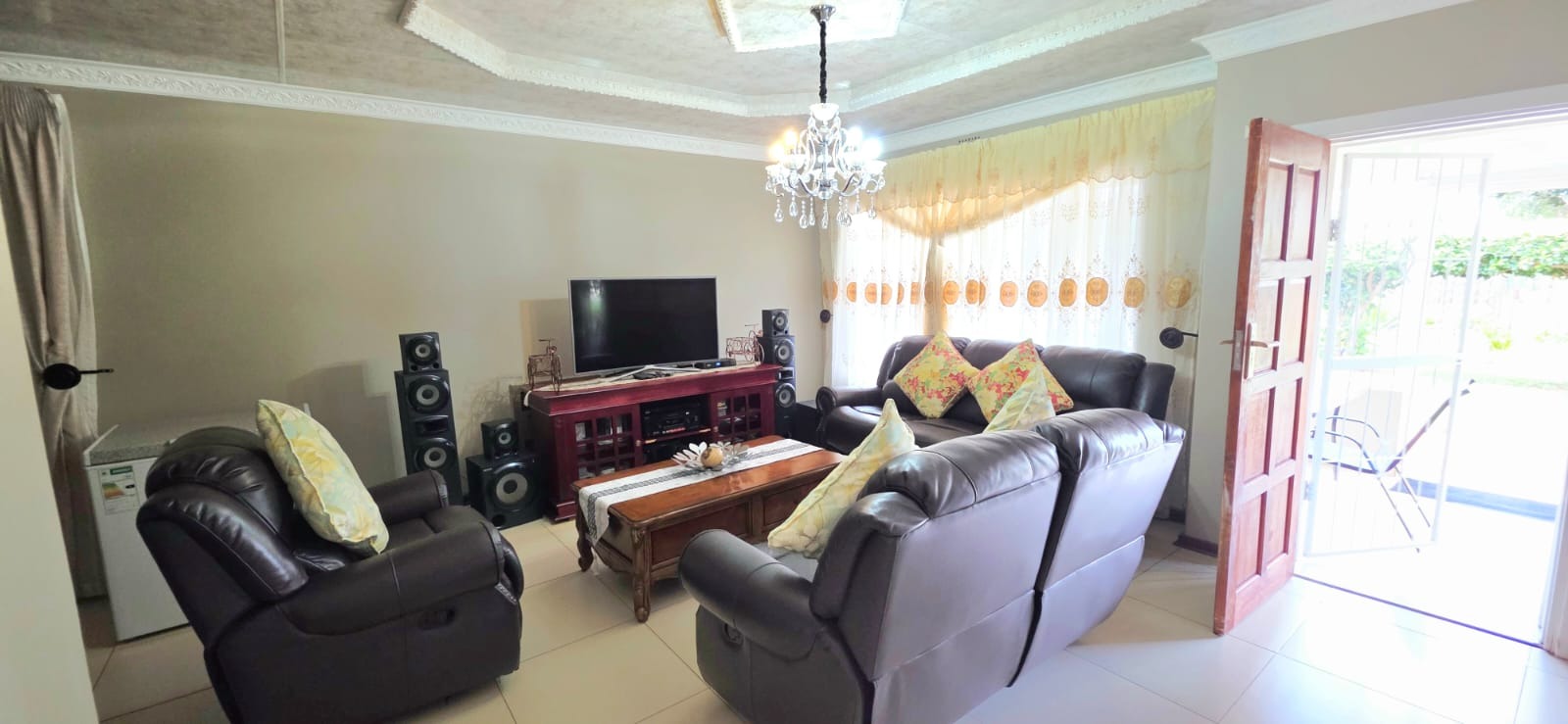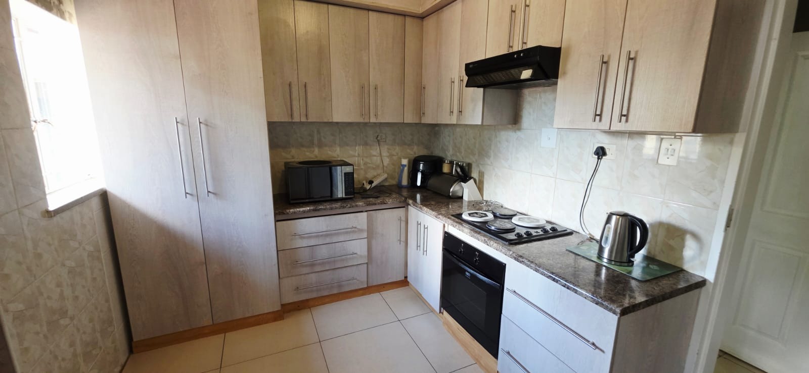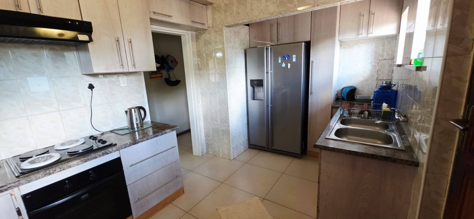 Step inside and discover a home with a warm and inviting feel. The combined living and dining area is a great spot for relaxing or entertaining, featuring neutral walls, durable tiled floors, and plenty of natural light streaming in through large windows. You'll find comfortable seating and decorative chandeliers that add a touch of charm to the space. The kitchen is practical and well-equipped with light wood-toned cabinetry, a built-in oven, and tiled flooring, making meal prep a breeze.