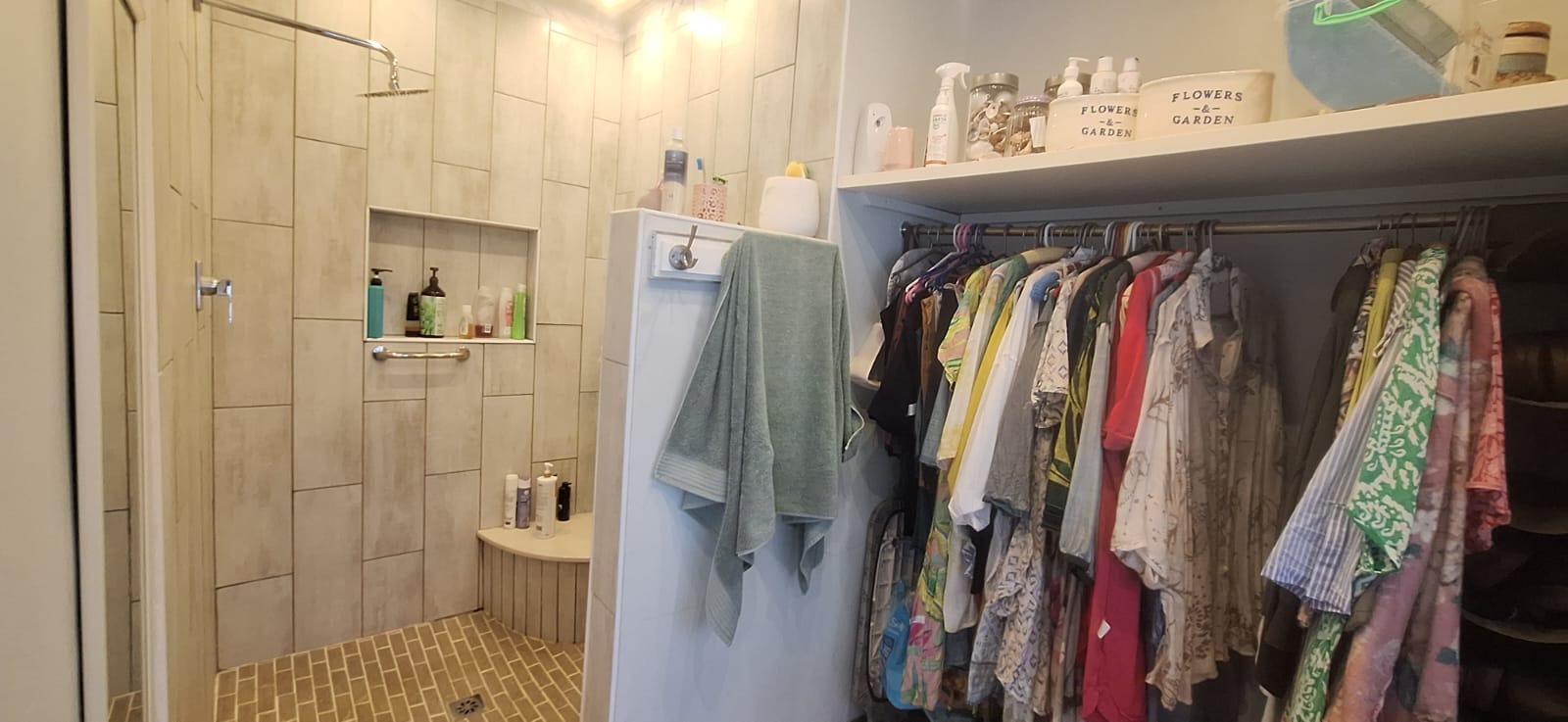 The main bedroom features an en-suite bathroom, a spacious walk-in closet with a shower inside, and a door leading out to the beautifully kept yard — the perfect place to enjoy your morning coffee. The two additional bedrooms are neat and comfortable, with built-in cupboards, and there’s a second bathroom for family or guests.