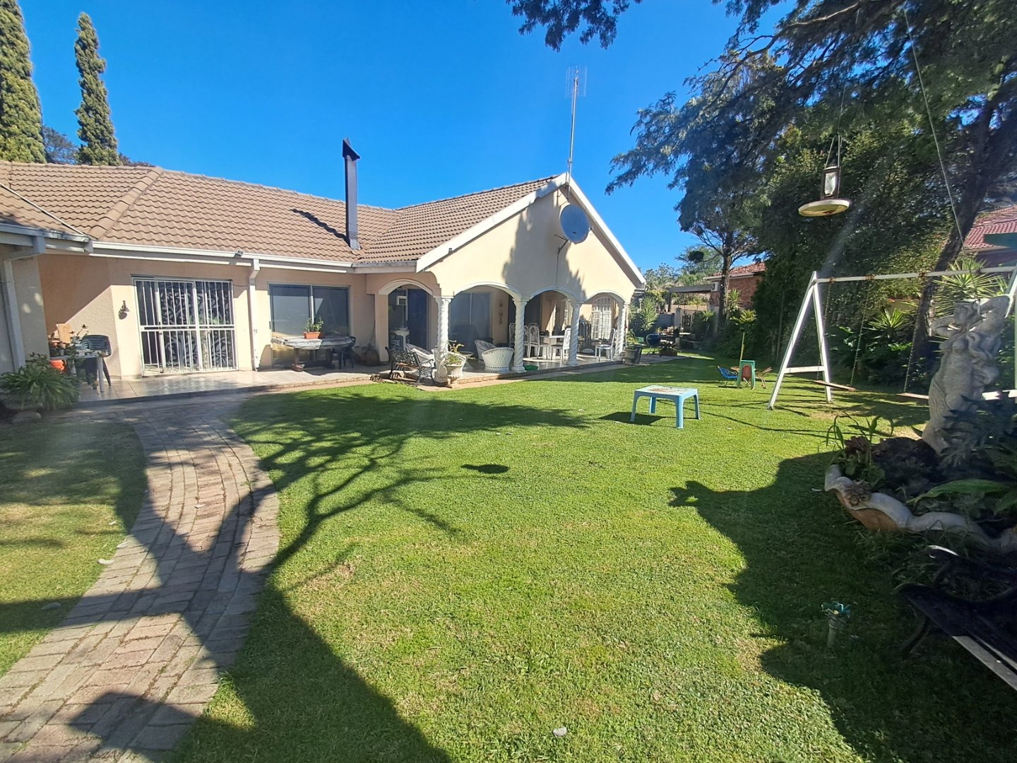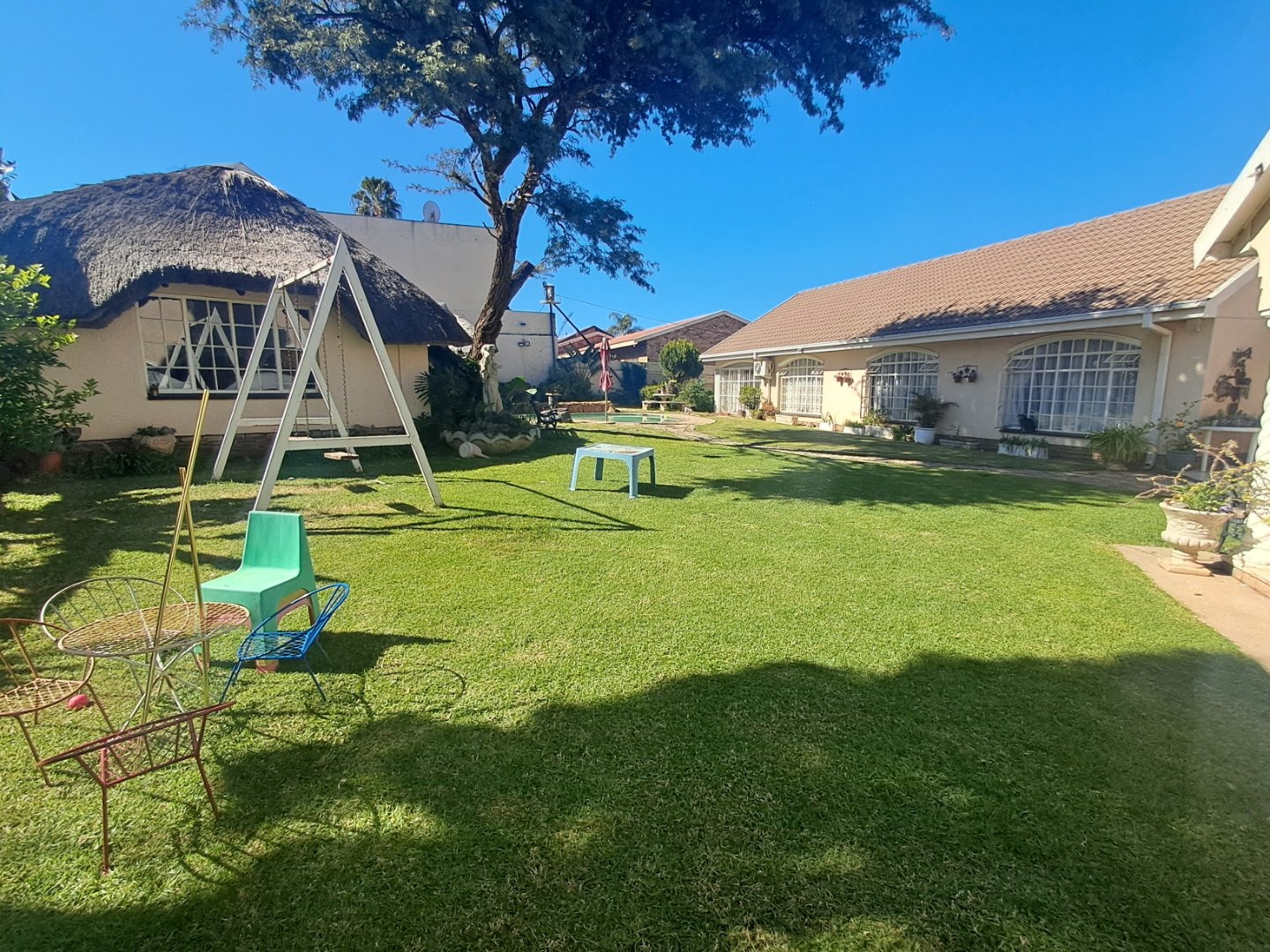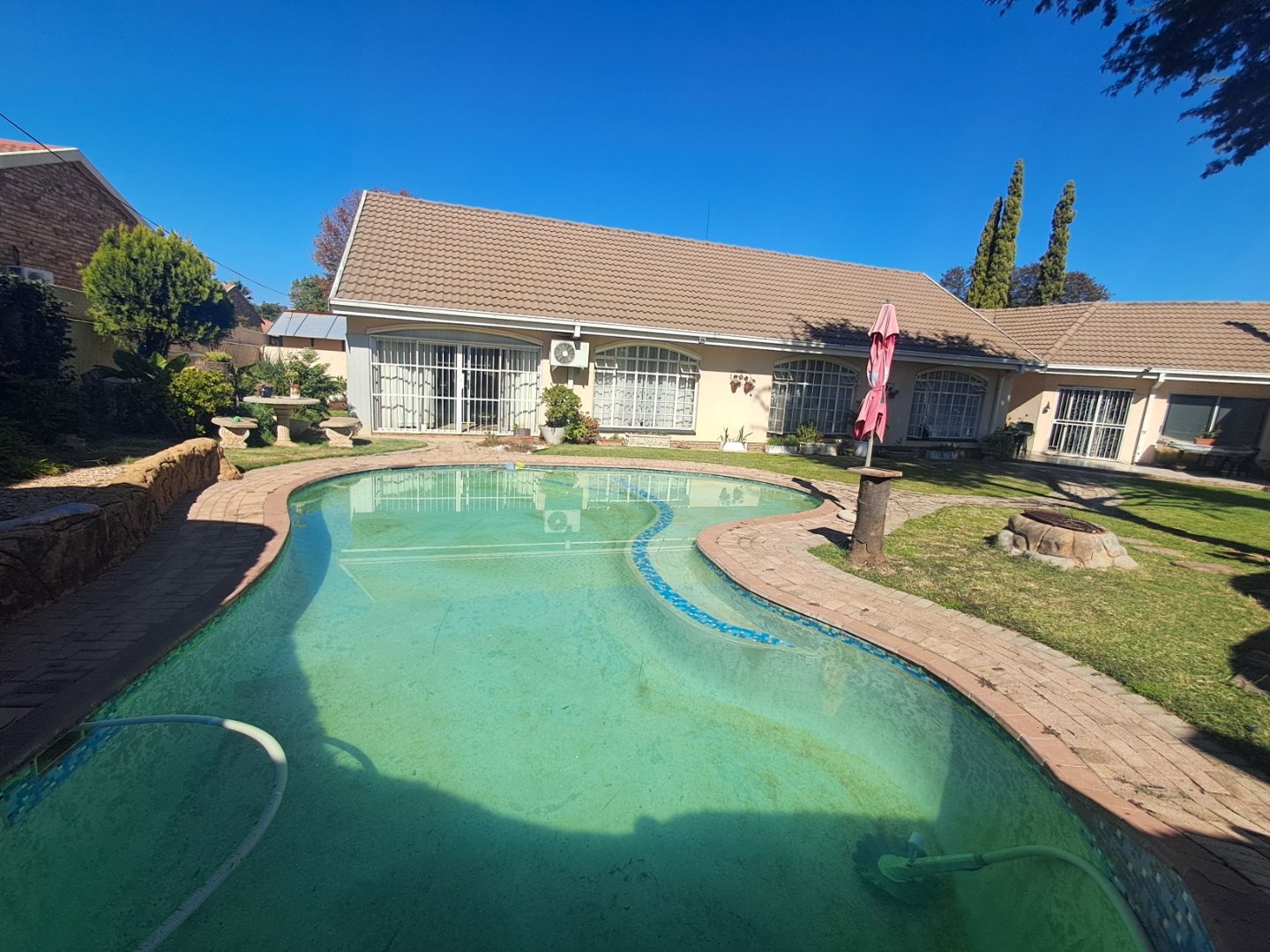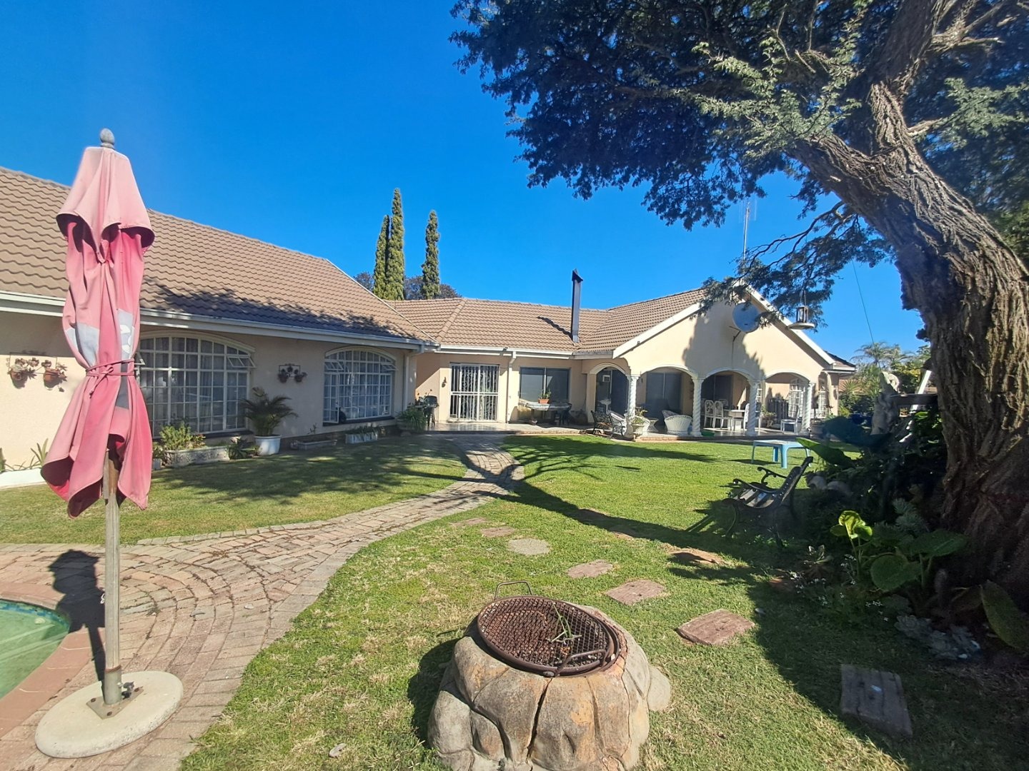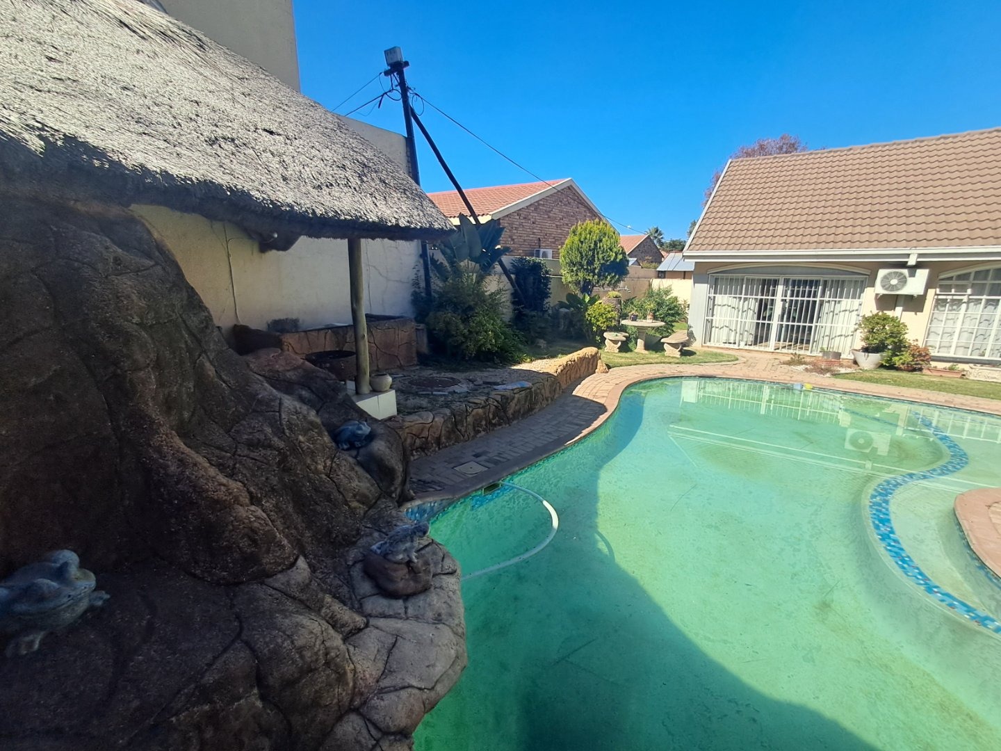 The modern kitchen is well-equipped with stylish cabinetry and a gas stove, making meal preparation a joy. Additional features like a separate study, an ironing room, and a gas geyser add to the home's convenience and practicality. Outside, you'll find a lush garden with a sparkling pool, two thatched lapa areas—one with a built-in bar and another with a fireplace—perfect for entertainment.