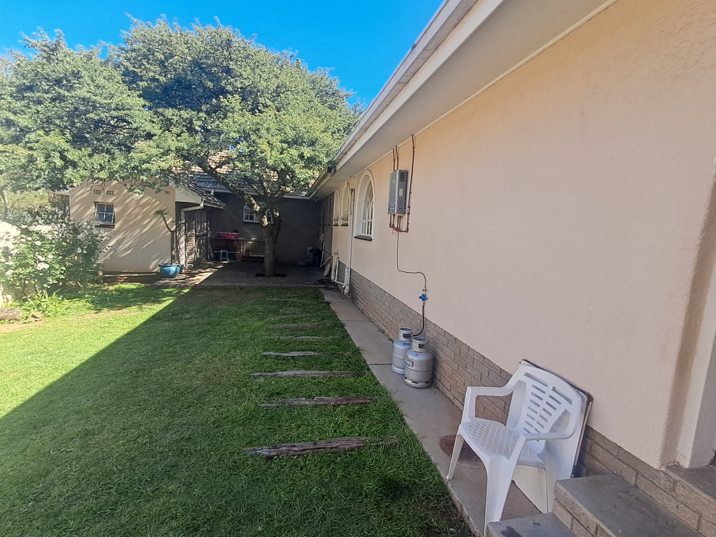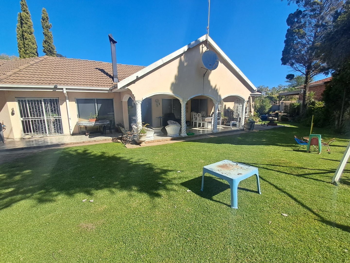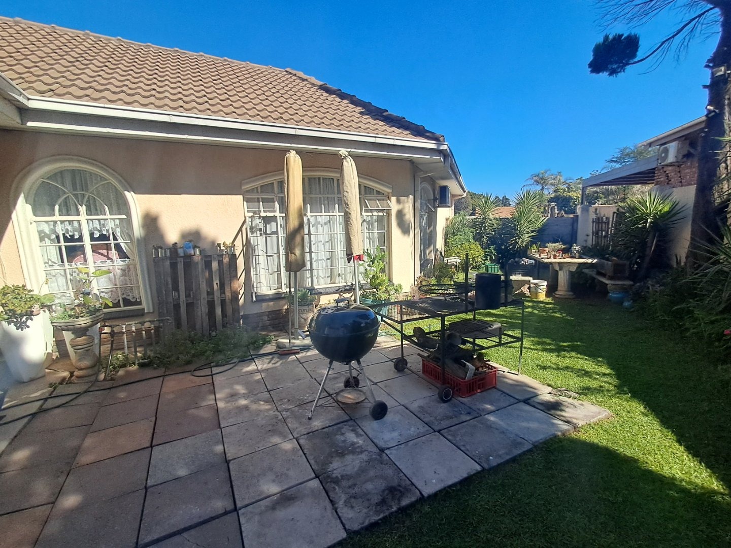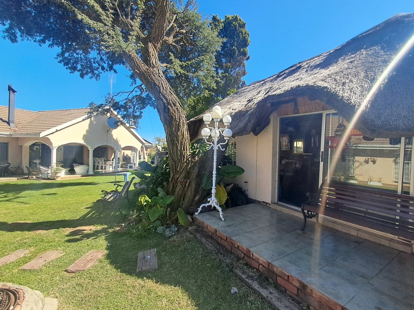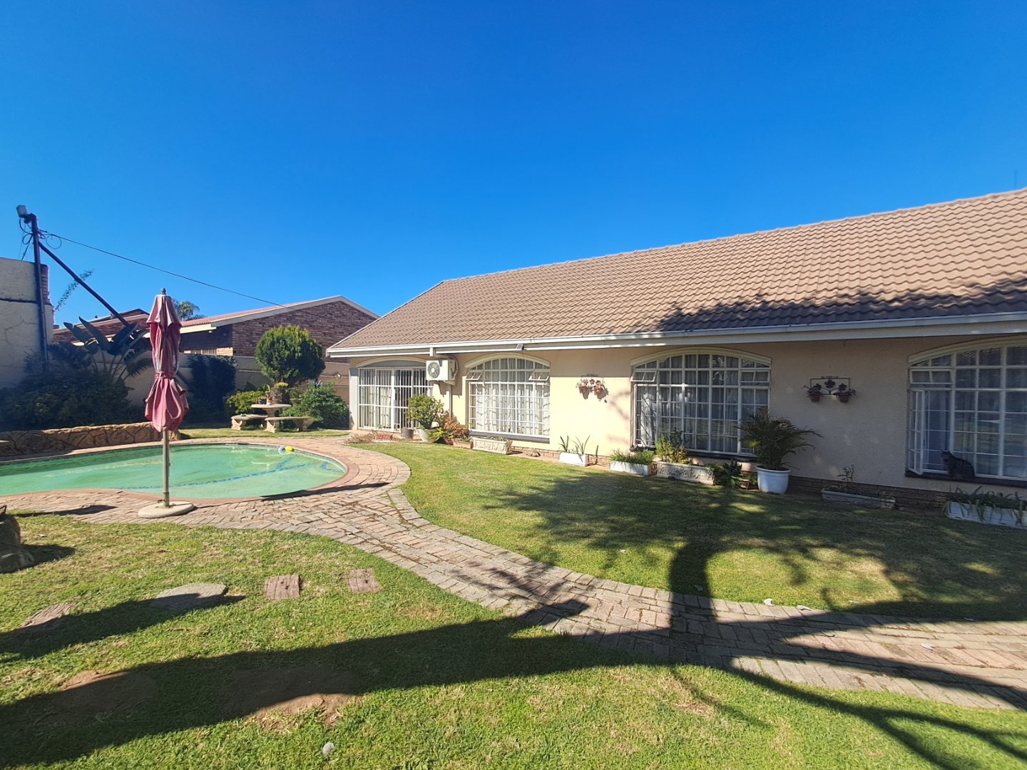 The modern kitchen is well-equipped with stylish cabinetry and a gas stove, making meal preparation a joy. Additional features like a separate study, an ironing room, and a gas geyser add to the home's convenience and practicality. Outside, you'll find a lush garden with a sparkling pool, two thatched lapa areas—one with a built-in bar and another with a fireplace—perfect for entertainment.